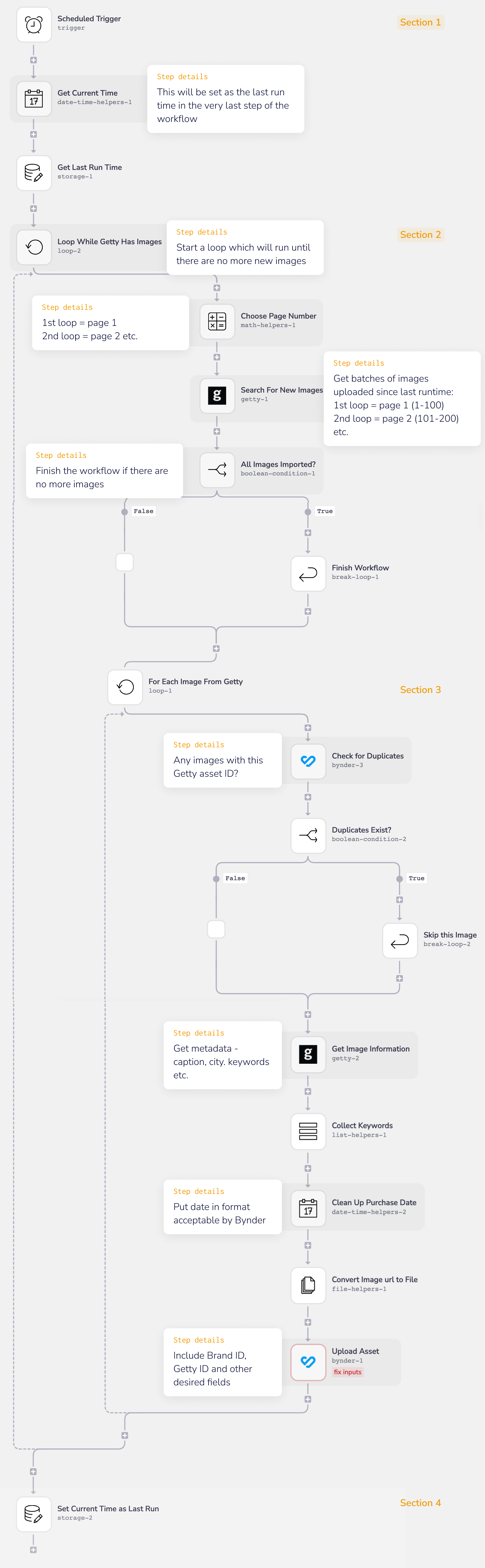 **Section 2: ** In the main loop, Getty is polled for all images that have been purchased since the last workflow run time. Getty returns a list of images and their metadata.