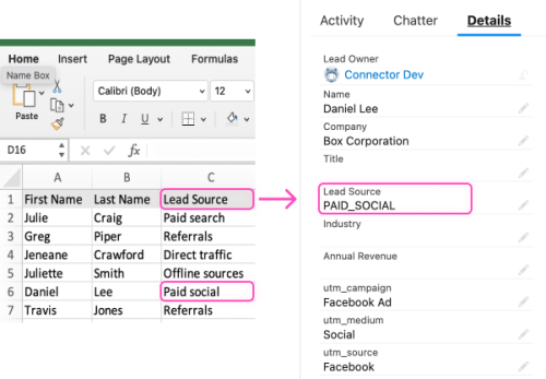 Note that the actual value for Lead Source ('Paid Search', 'Referrals' etc.) is mapped according to the data mapping section above.