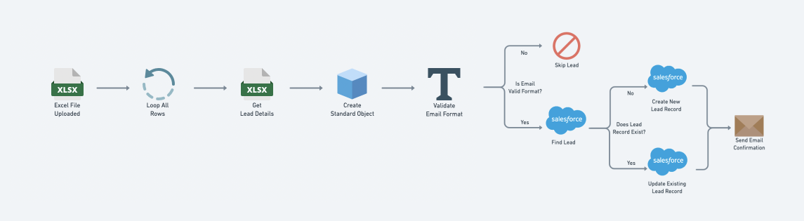 The purpose of this workflow is to capture leads from an Excel / XLSX file and use these to create and update contacts in Salesforce. This workflow is fired every time a Excel / XLSX file is added to a Tray form: