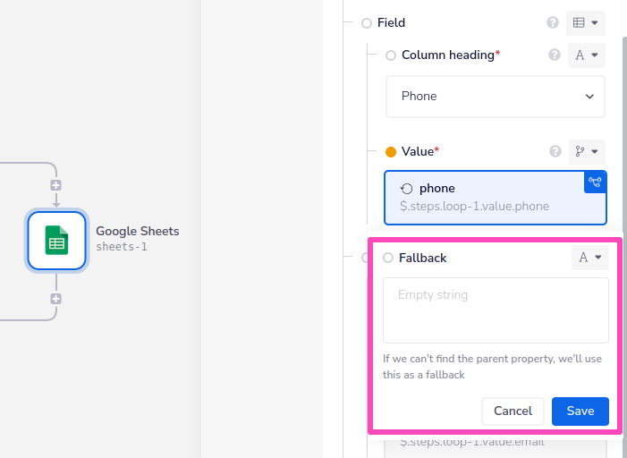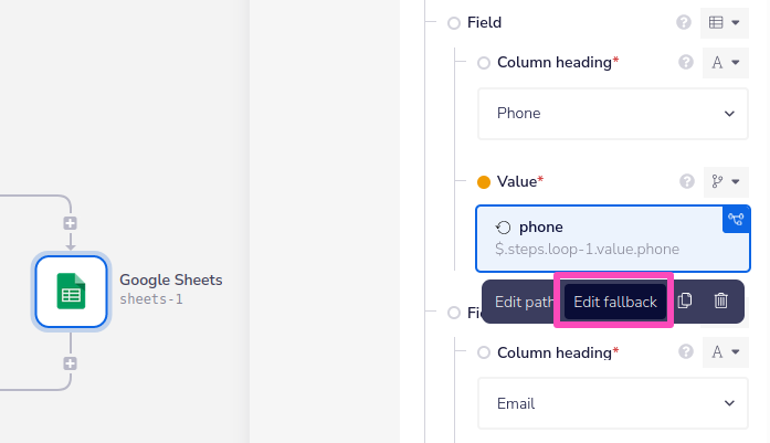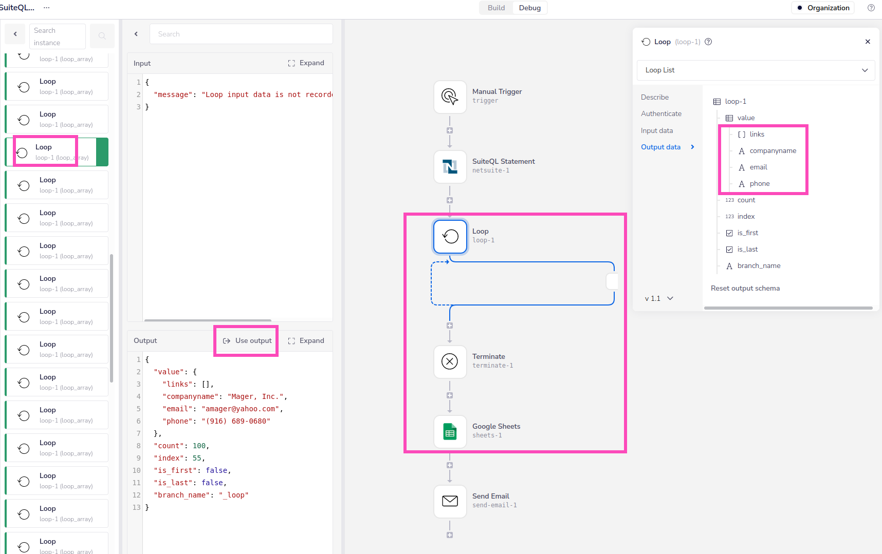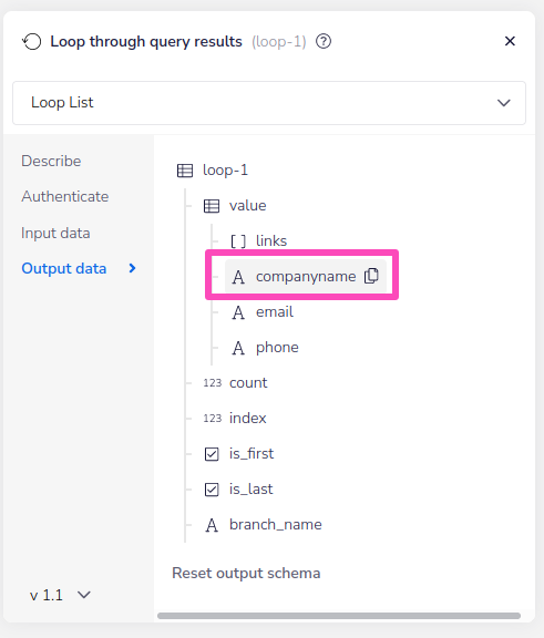 You will then be able to copy the jsonpath for each piece of data - e.g. $.steps.loop-1.value.companynameOnce done, reset your workflow to its original state!