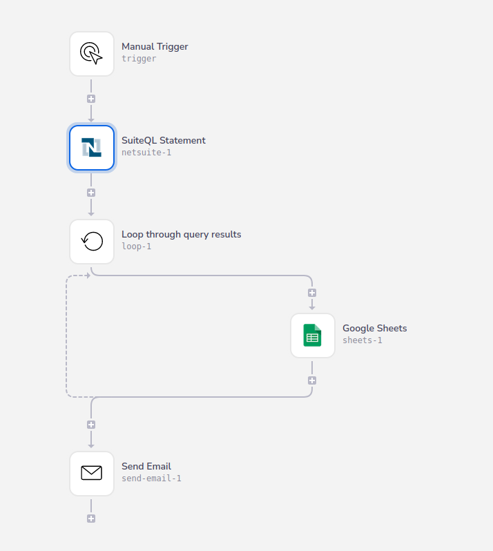 The end result of this workflow is that records (e.g. customers) will be pulled from Netsuite, addded to a Google Sheet and then emailed to a chosen email address when complete, including a link to the Google Sheet: