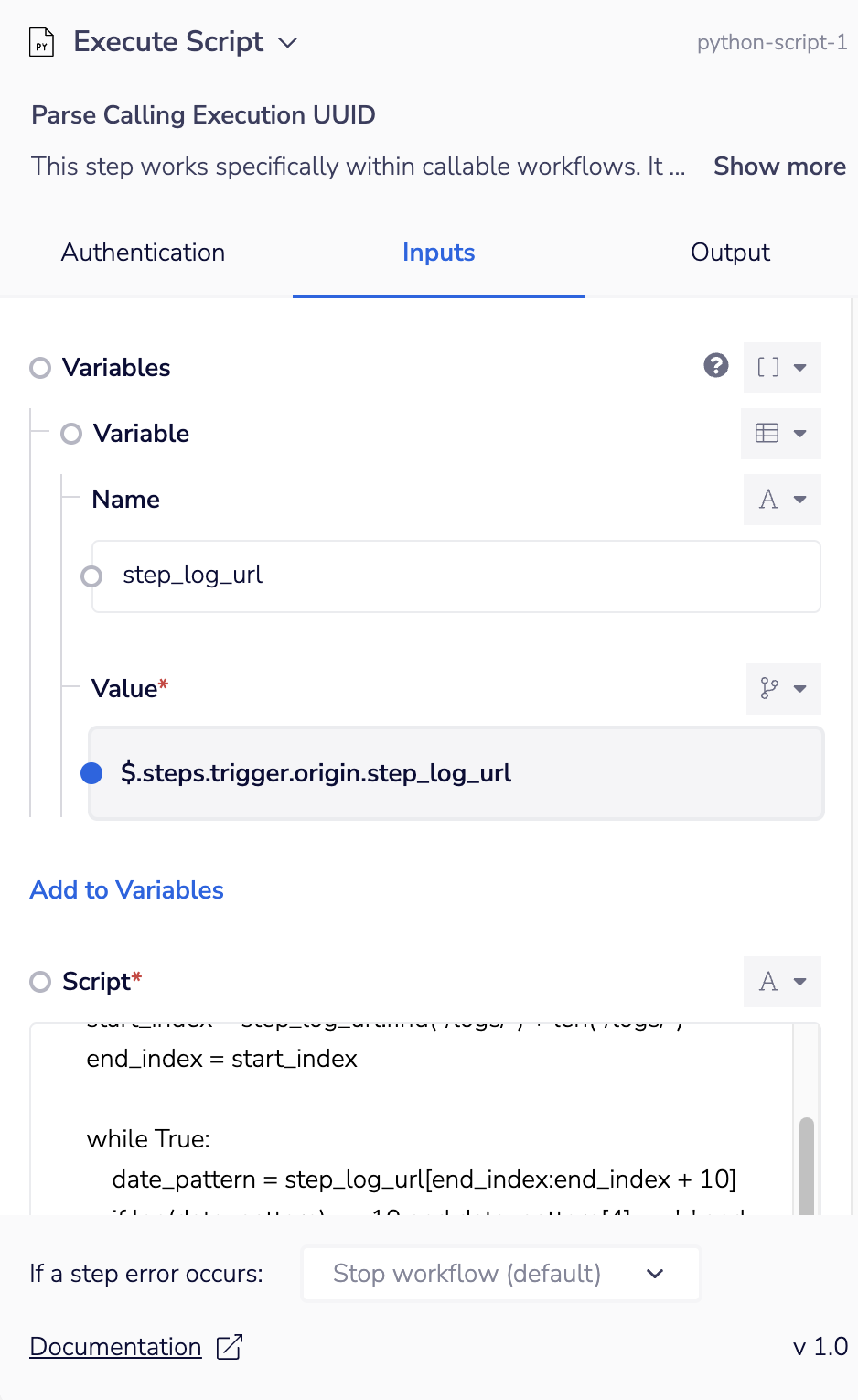 This was inspired from a conversation in our community. You can use this step to parse the UUID of a calling workflow and then use that data downstream. This snippet ONLY works for workflows with a callable trigger OR alerting trigger