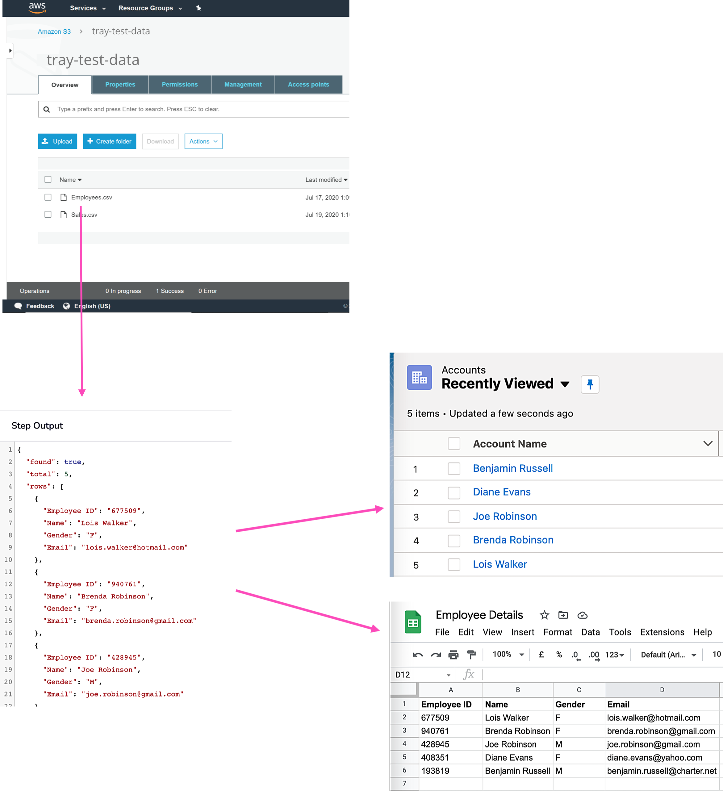 The following graphic demonstrates the process of downloading a csv from S3, using Tray to extract the data and sending it to a service of your choice (Salesforce or Google Sheets in this case):
